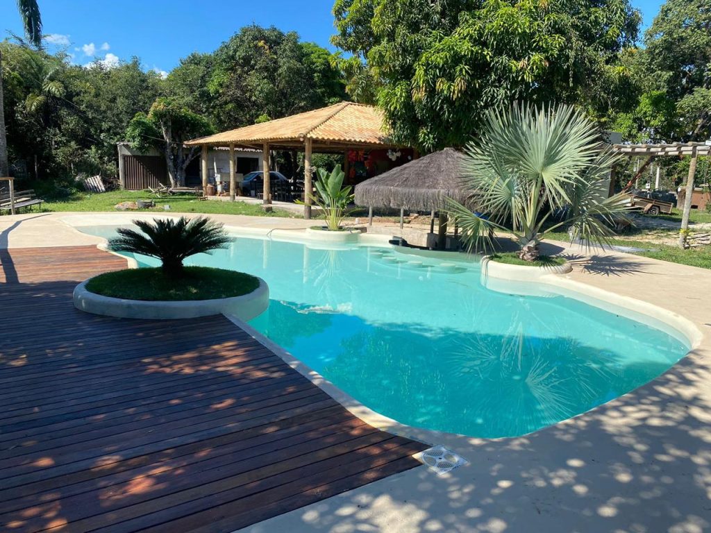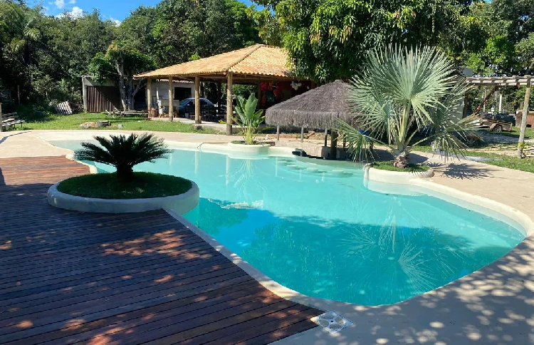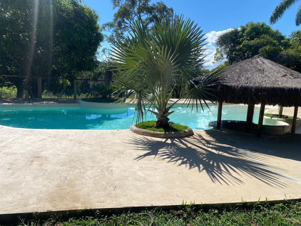O SITIO NOSTRA CASA é um lugar incrível! Com uma piscina em formato de lago com bar molhado, hidromassagem e quiosque, o cenário é repleto de natureza exuberante, com árvores e plantas tropicais que criam uma atmosfera de tranquilidade e relaxamento.